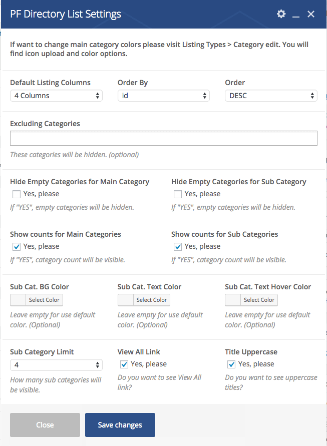 By using “PF Directory List” element which can easily be added through Visual Composer, you can create your category list that you have added to PointFinder. If you wish, you can filter listing categories or other taxonomies.